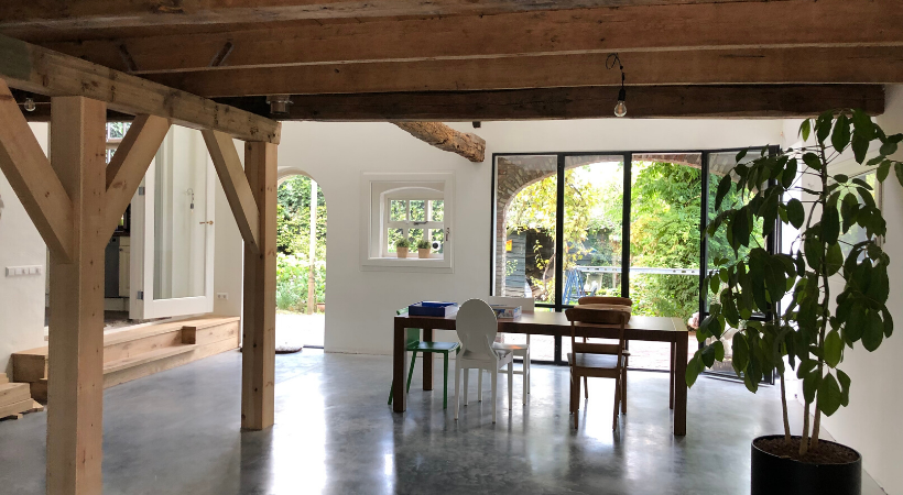 Als je goed kijkt op de foto voor dan zie je drie kleine ramen en een deur (links). Op de na foto zijn twee ramen vervangen door een stalen kozijn met een deur naar buiten. De vroegere deur is een raam geworden.