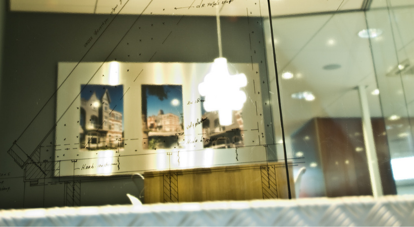 Piet is nog steeds aanwezig op kantoor. Op een glazen wand van de overlegruimte is een foto geplakt van een bouwtekening, die Piet zelf heeft getekend.